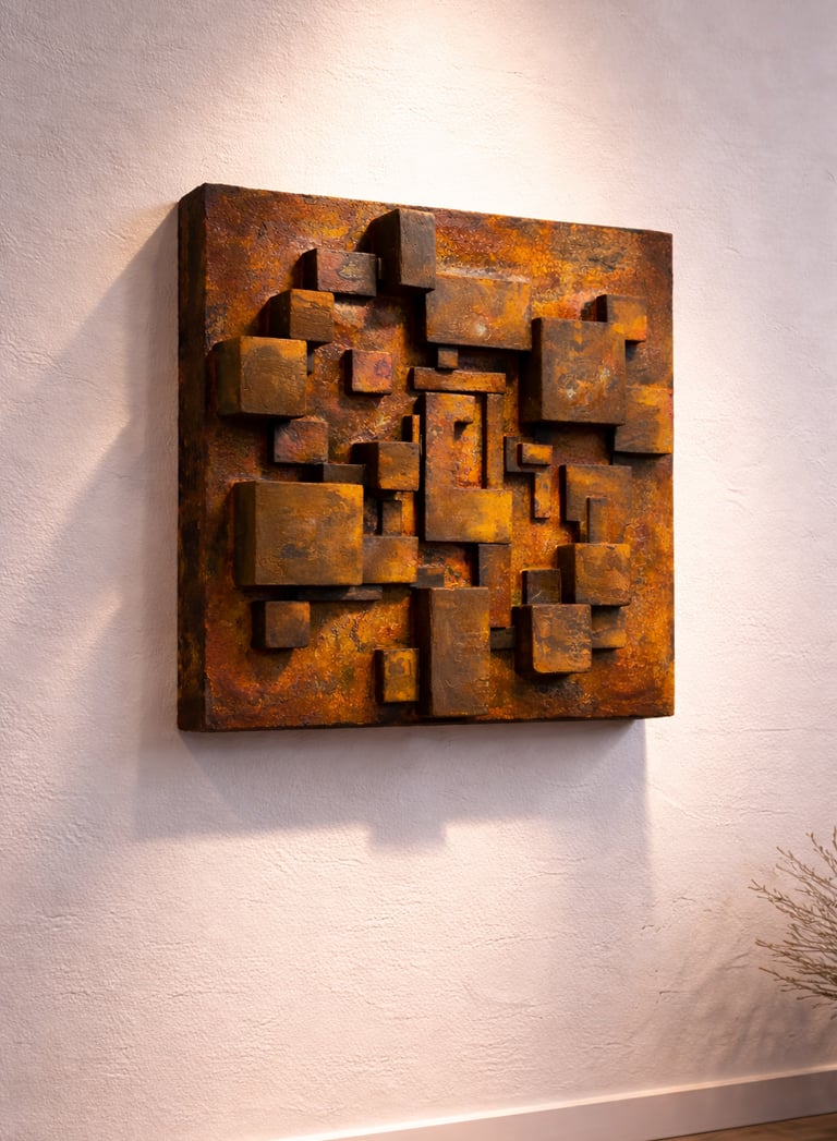 De Cubiq serie ontstaat vanuit een zorgvuldig opgebouwd proces van laag over laag, waarin materiaal de ruimte krijgt om te spreken. Handmatig geconstrueerde kubische vormen worden verdiept en verfijnd, waarna pigmenten en texturen elkaar versterken in warme en doorleefde roesttonen. Elk werk draagt sporen van hand en tijd, waardoor het niet alleen een geometrische compositie is, maar ook een tastbare ervaring van structuur, diepte en verstilling.