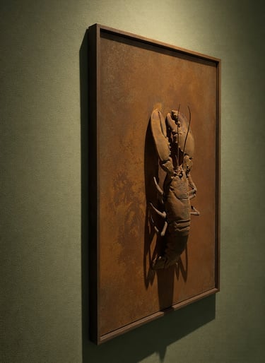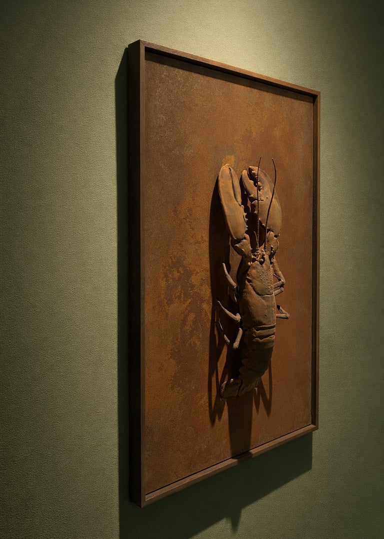 Dit werk vangt de krachtige vorm van de kreeft in een stoer, sculpturaal ontwerp. Het oppervlak is afgewerkt met een echte roestlaag via een gecontroleerd oxidatieproces. De warme aardetinten en ruwe textuur geven het beeld een doorleefd, industrieel karakter — elk exemplaar is uniek in structuur en uitstraling.